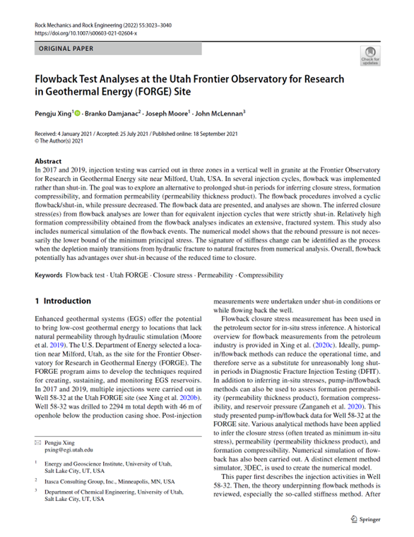 Injection testing conducted in 2017 and 2019 at the Frontier Observatory for Research in Geothermal Energy (FORGE) site in Utah evaluated flowback as an alternative to prolonged shut-in periods to infer closure stress, formation compressibility, and formation permeability. Flowback analyses yielded lower inferred closure stresses than traditional shut-in methods and indicated high formation compressibility, suggesting an extensive fractured system. Numerical simulations showed rebound pressure is not necessarily the lower bound of minimum principal stress. Stiffness changes can be identified as depletion transitions from hydraulic to natural fractures. The advantage if flowback is reduced time to closure.